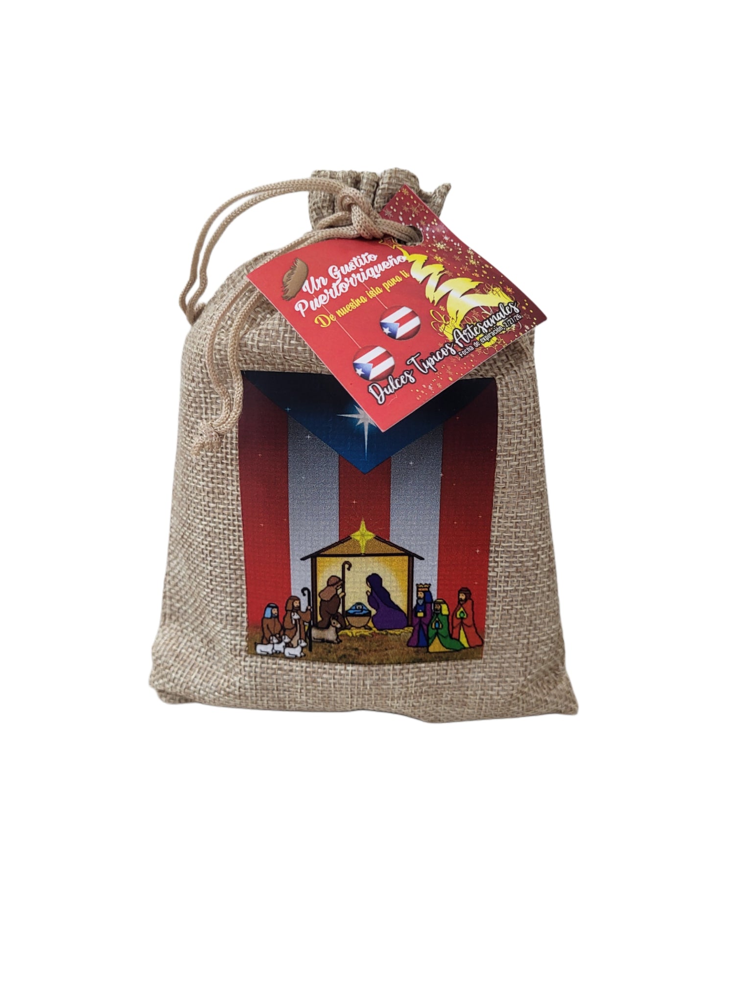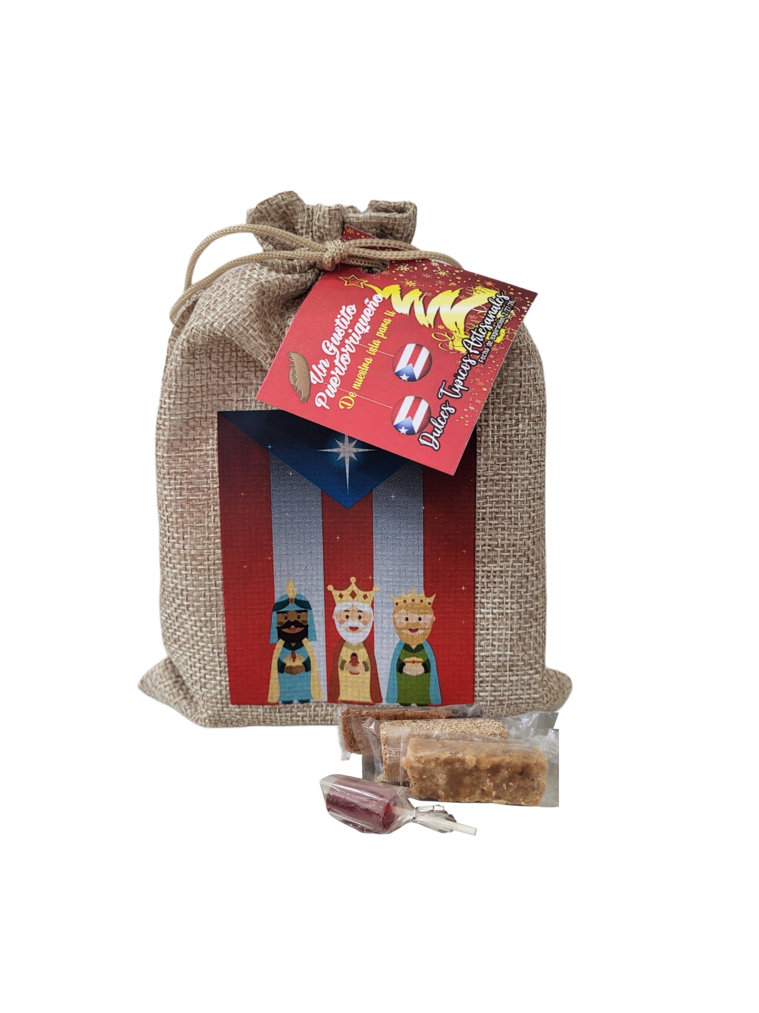 Saquito surtido 4 pz Navidad con,Marrallo, Ajonjolí, Dulce Coco y Pilon. Diseño de Bandera con Reyes Magos y Bandera con pava y pascua.