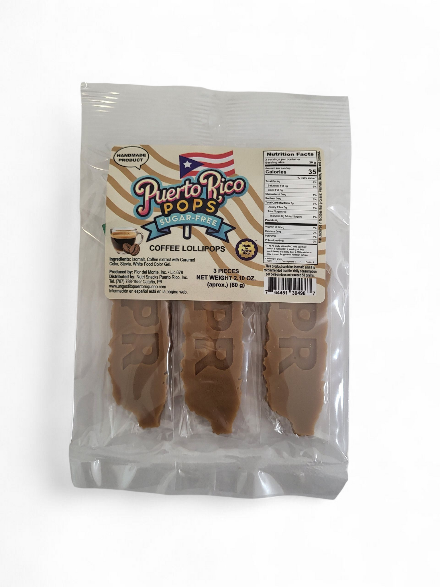 Deliciosas paletas "Sugar free" hechas con Isomalt,con sabor a Coco,piña, fresa o café, con el mapa de Puerto Rico.